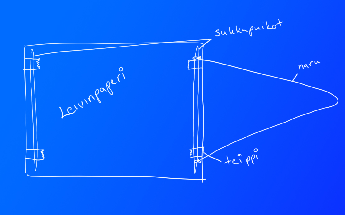 - Jotain pitkää ja ohutta x 2 (esim. sukkapuikko), jonka voi teipata leivinpaperiin kiinni.